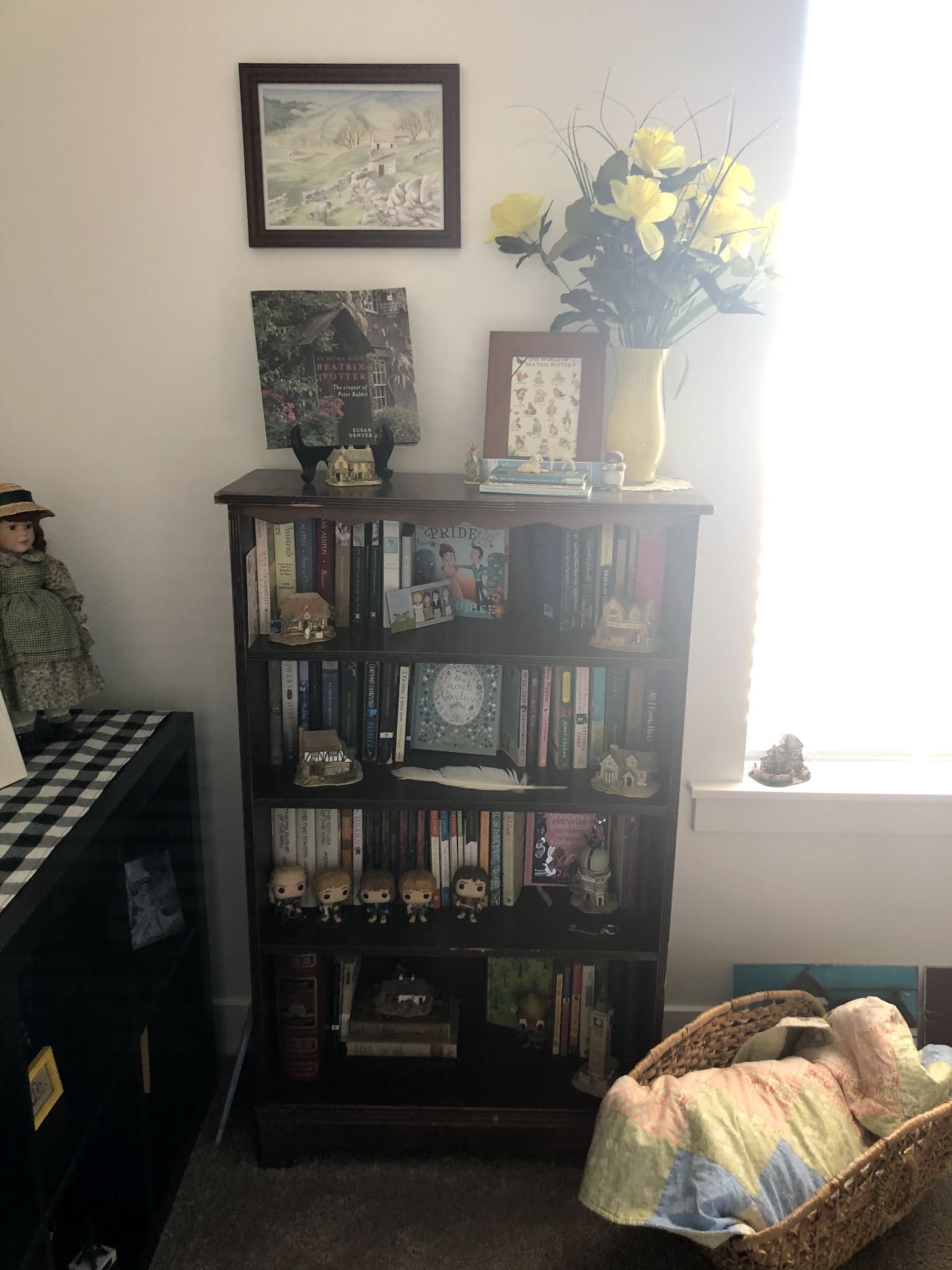 This room has changed a bit- when I first finished it looked like it does in this picture when you walked in, but now my reading chair is in that corner, the shelf with the flowers is where the Harry Potter shelf used to be and the other shelves are on the same wall as the other shelves, but I'll show that new arrangement later.